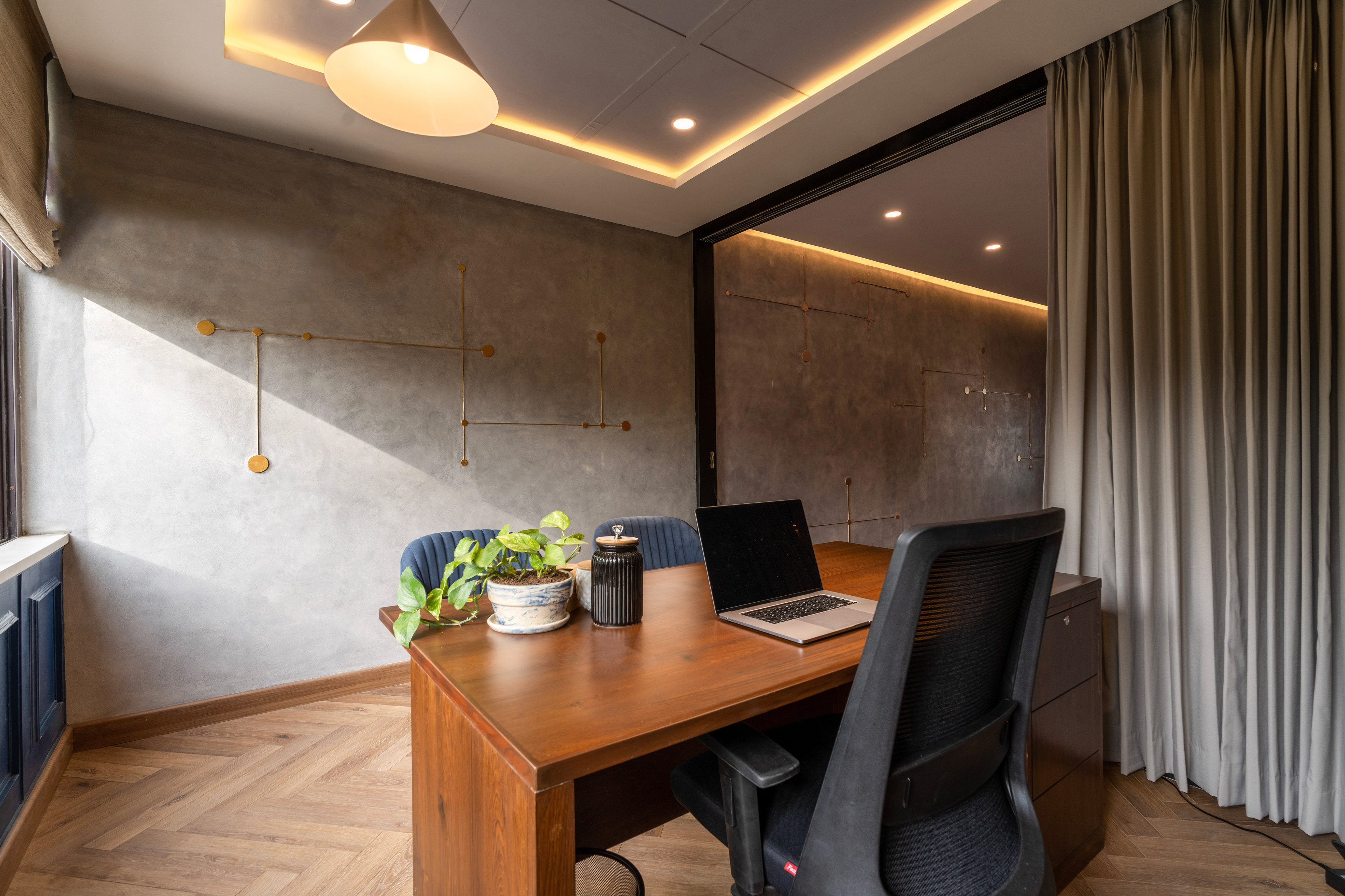 An Asian Paints concrete wall embedded with brass designs runs along one side of the space, connecting the shared work area to the private one. The revamped workspace perfectly embodies Arjun’s photography practice. It provides ample room for Arjun’s many collaborators (models, camera crew, and hair and makeup artists, to name a few) to come together and play.